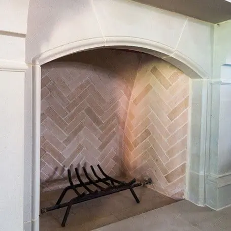 If you’d rather add some drama to the interior instead of the exterior of the fireplace, do so by creating a beautiful backdrop. You can arrange stones, bricks and tiles inside of the firebox to create an eye-catching pattern that’s sure to draw family and friends towards your living room. Herringbone style brick like the design featured in our customer favorite Normandy mantel on the left is classic look.