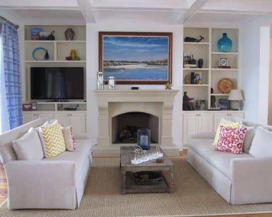 The versatility of white comes in the fact that it can still provide the same impact in a variety of shades. Highlight subtle contrasts with warm grey undertones and add a stark color contrast, like the turquoise blue in the room below provides. The OWS Amhurst cast stone mantel’s contrast with the subtle pastel like colors and the bright blue brings the sleek palette to life. A light fireplace can create visual interest and an eclectic look at the same time.